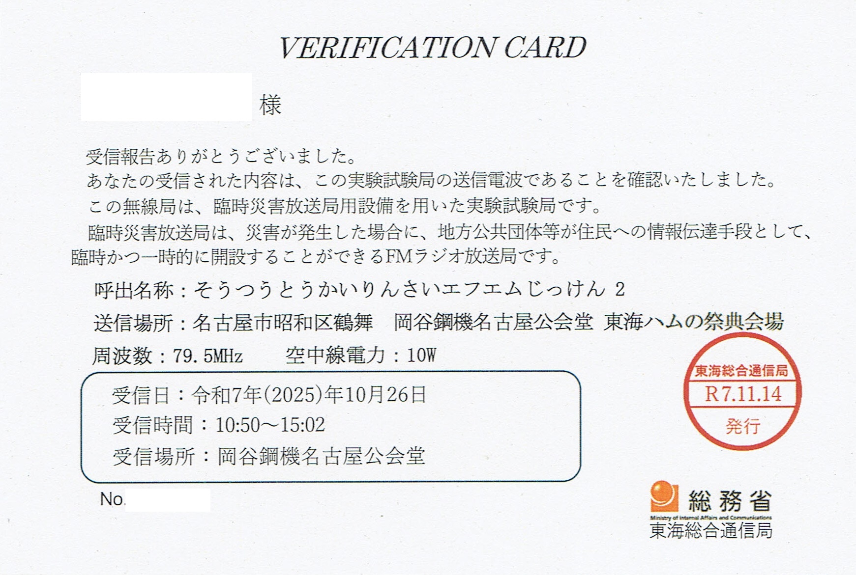 (お知らせ)第57回東海ハムの祭典の特別企画で運用された「臨時災害放送局設備を用いた実験試験局」のベリカードについて (10月27日追記)